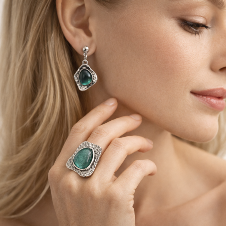 La colección Camille se inspira en la fuerza serena de la naturaleza y en la belleza auténtica de los materiales nobles. Piedras de tonos verdes profundos, engastadas en metal plateado, evocan paisajes minerales, equilibrio y conexión con lo esencial.